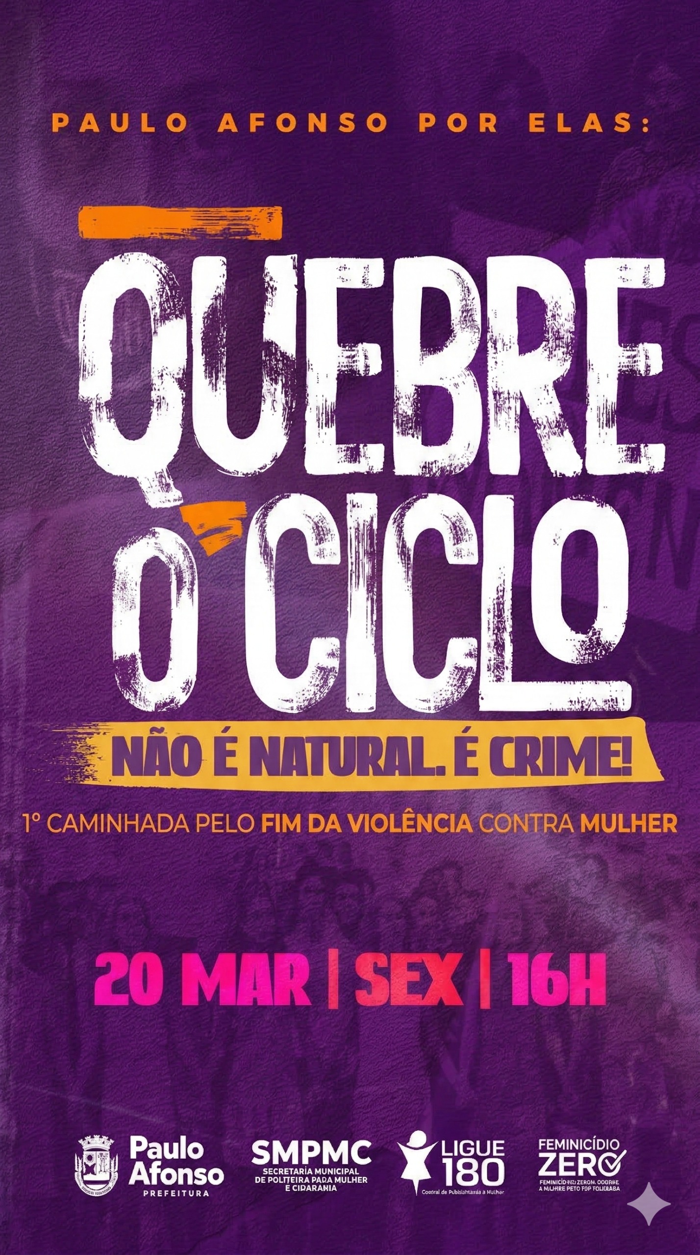 A Prefeitura de Paulo Afonso, por meio da Secretaria Municipal de Políticas para Mulher e Cidadania (SMPMC), realiza nesta sexta-feira, 20 de março, às 16h, a 1ª Marcha Paulo Afonso por Elas. Com o slogan “Quebre o ciclo: Não é natural, é crime”, o evento encerra a programação do Março Mulher com uma grande mobilização social pelas ruas do centro.