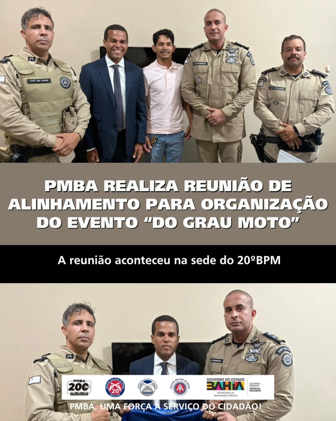 Na tarde de ontem, o Major PM Marcus, representando a Tenente-Coronel PM Emília Neta, Comandante do 20º Batalhão de Polícia Militar, participou de uma reunião com o advogado Thiancle Araújo (OAB/BA 21540), Vitória Santana e Ítalo Cavalcante, representante do evento “Do Grau Moto”.