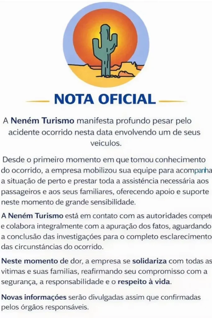 A Neném Turismo afirmou que mantém contato com as autoridades responsáveis pela ocorrência. A empresa declarou que colabora integralmente com a apuração dos fatos e aguarda a conclusão das investigações para esclarecer as circunstâncias do acidente.