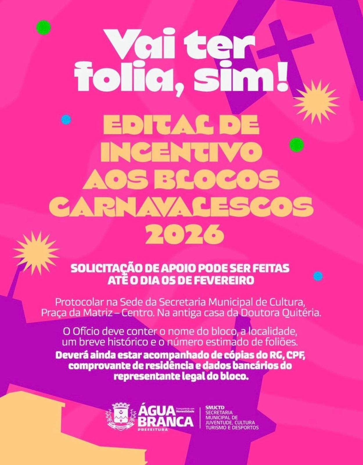 A Prefeitura de Água Branca anunciou a abertura do edital que garante apoio financeiro aos blocos carnavalescos que irão desfilar no Carnaval 2026. A iniciativa é coordenada pela Secretaria Municipal de Juventude, Cultura, Turismo e Desportos e busca fortalecer a tradição da festa no município.