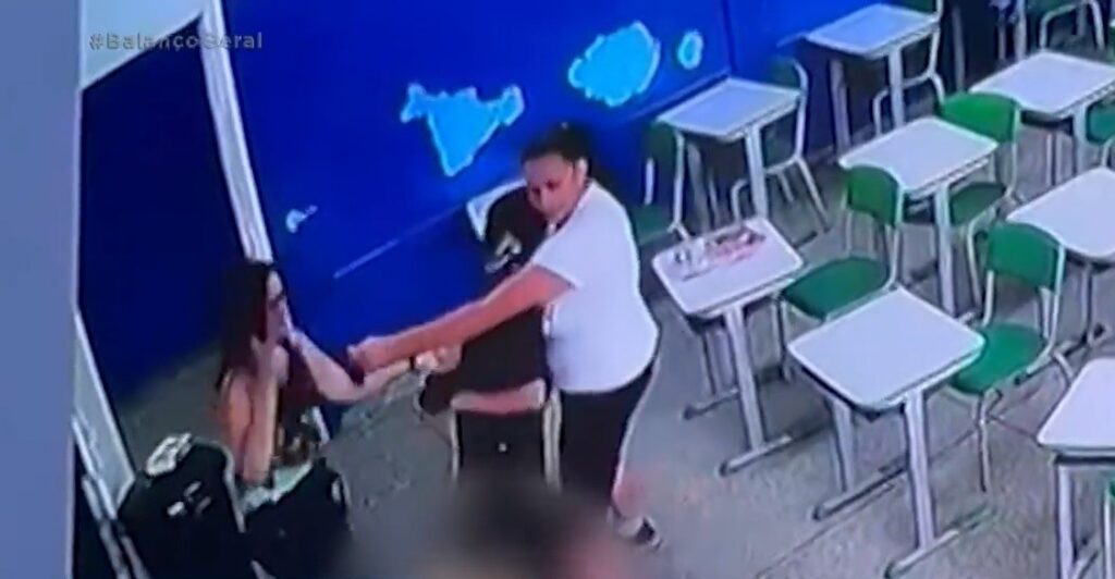 O vídeo da câmera de segurança da escola mostra o momento em que a professora encurrala o aluno, entra sala e o pega pelo braço. Em seguida, a profissional segura o estudante pelo pescoço e outra funcionária da escola ajuda a desarmá-lo. Ela segurou o agressor até a chegada da polícia, três minutos depois de acionada.