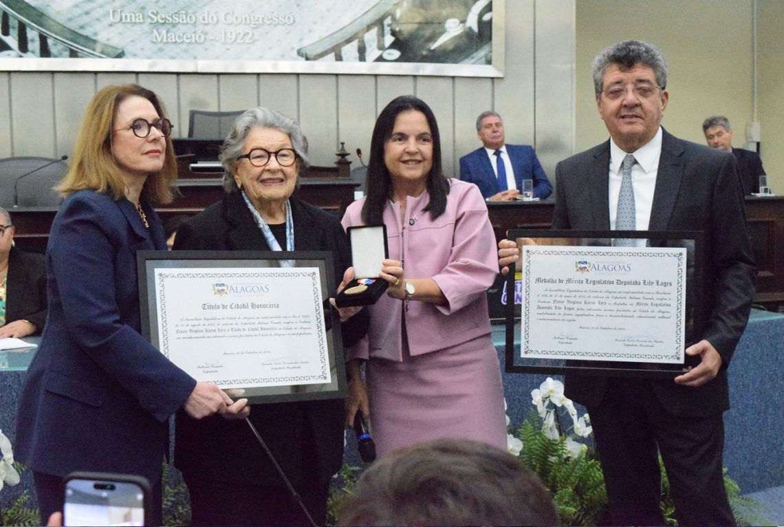 Em uma solenidade marcada por emoção e reconhecimento, a Assembleia Legislativa do Estado de Alagoas concedeu, na manhã desta segunda-feira (06), a Medalha de Mérito Legislativo Deputada Lily Lages e o Título de Cidadã Honorária de Alagoas à senhora Nancy Virginia Karns Lyra, em reconhecimento aos relevantes serviços prestados ao Estado.