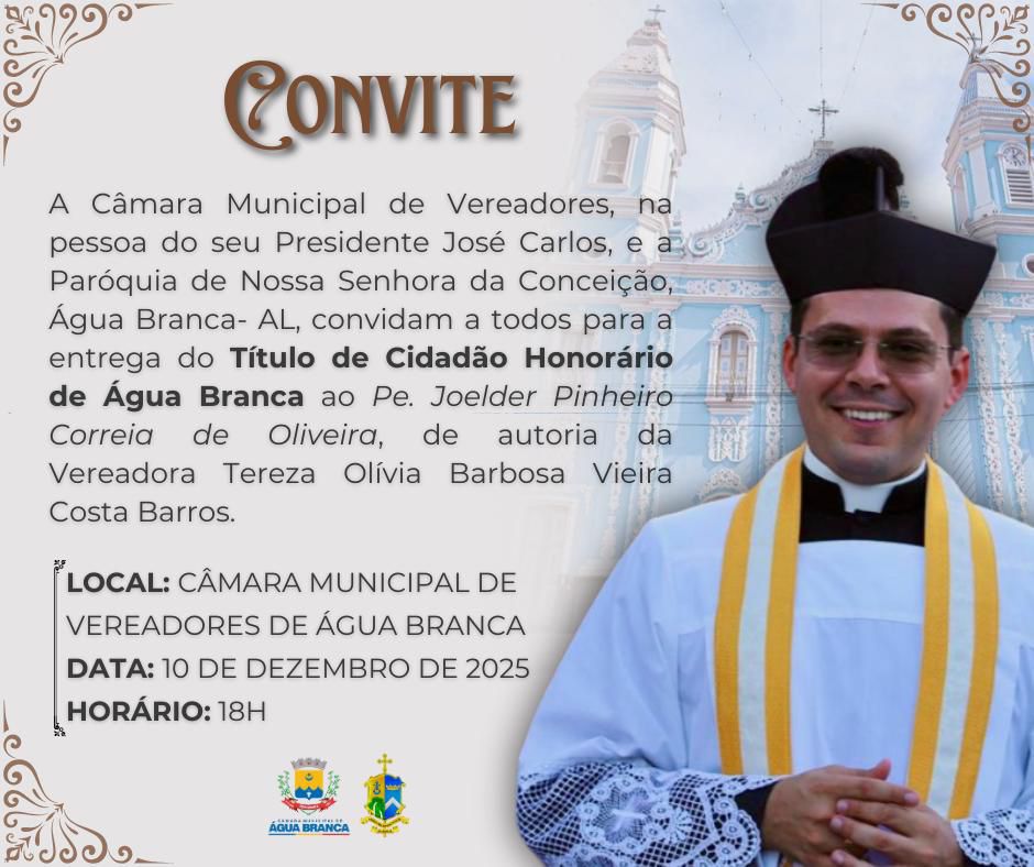 A Câmara Municipal de Vereadores de Água Branca, em parceria com a Paróquia de Nossa Senhora da Conceição, realizará nesta quarta-feira (10), às 18h, uma sessão solene para a entrega do Título de Cidadão Honorário de Água Branca ao Padre Joelder Pinheiro Correia de Oliveira.