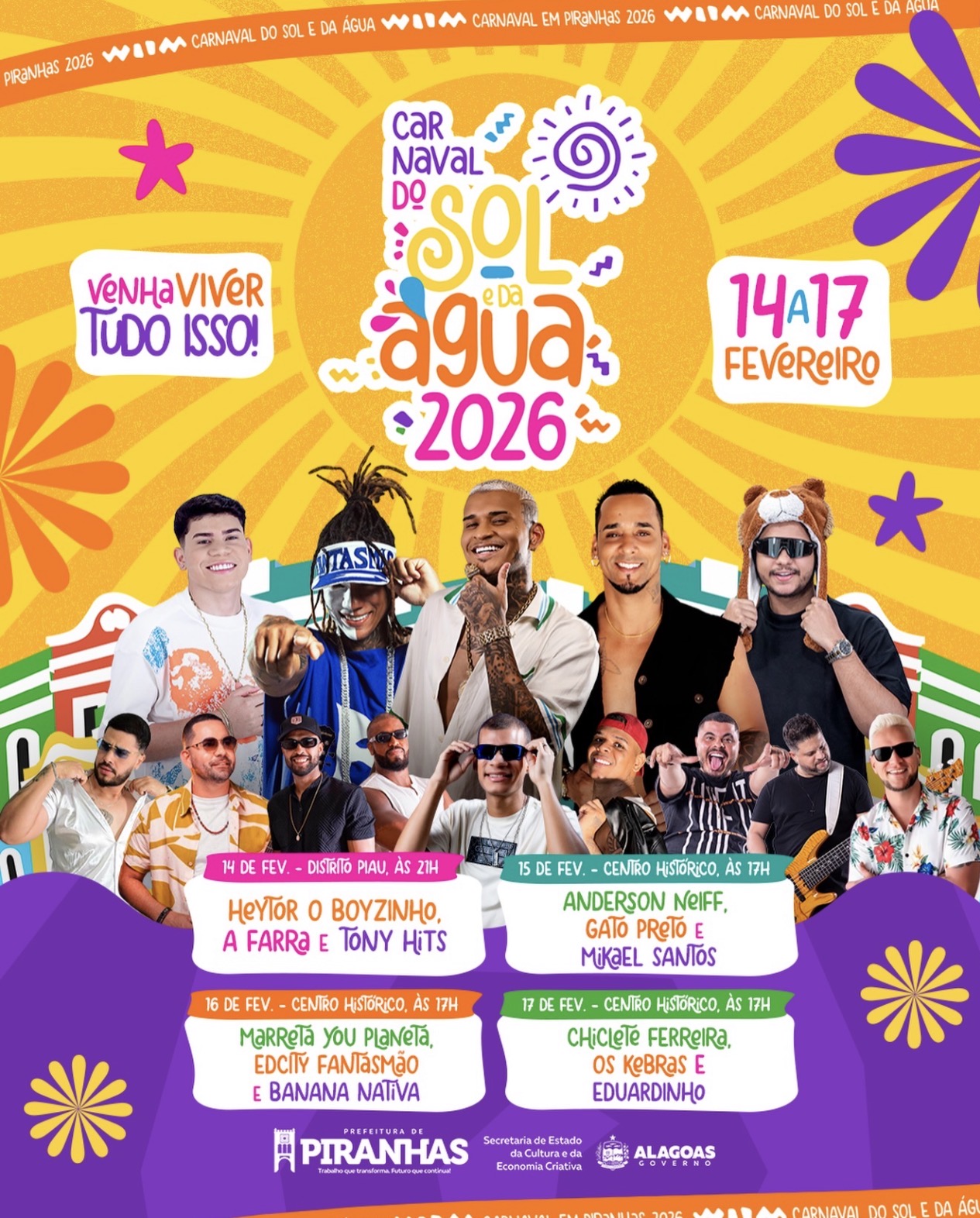 A Prefeitura de Piranhas divulgou a programação oficial do Carnaval do Sol e da Água 2026, que promete movimentar a cidade entre os dias 14 e 17 de fevereiro com uma agenda diversificada de shows e muita animação.