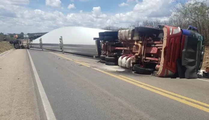 Uma carreta que transportava uma pá eólica tombou por volta das 11h40 desta quinta-feira (4), no km 62,3 da BR 316, em Ouricuri, Sertão de Pernambuco.