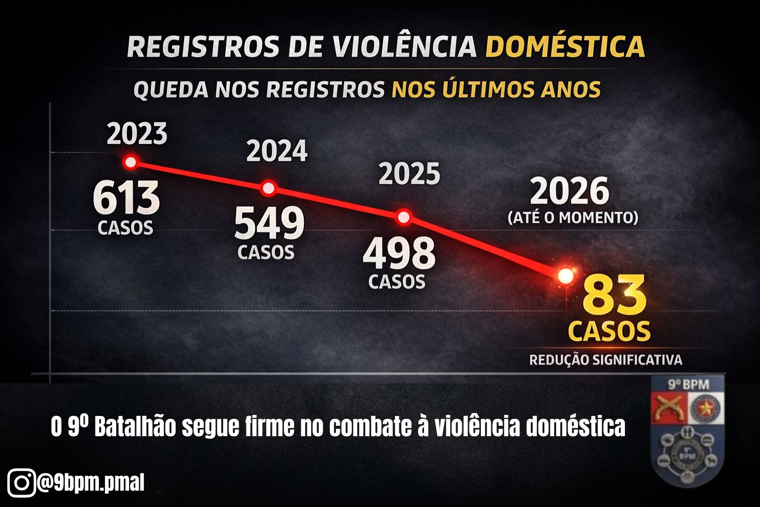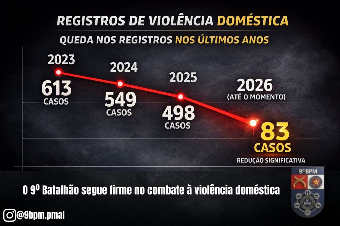 Levantamento divulgado pela assessoria de comunicação do 9º Batalhão da Polícia Militar de Alagoas aponta uma redução gradual nos casos de violência doméstica ao longo dos últimos anos na região atendida pela unidade.