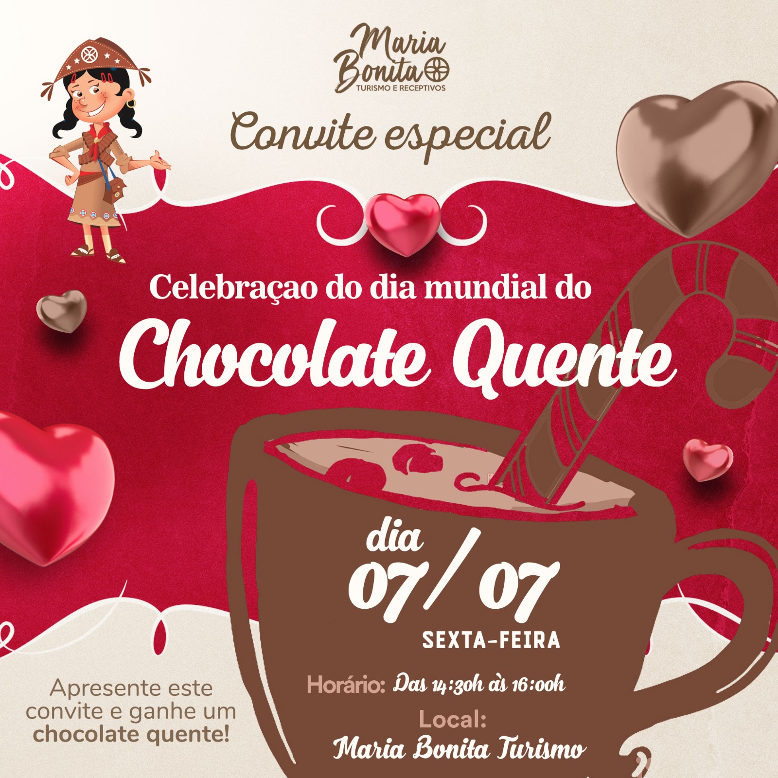 Nesta sexta- feira dia 7 de julho( dia mundial do chocolate) para você que for realizar a sua doação de peças usadas para o bazar que será realizado em prol dos Mochileiros de Cristo, a Maria Bonita Turismo tem um convite especial para você, que é a tarde do Chocolate Quente.