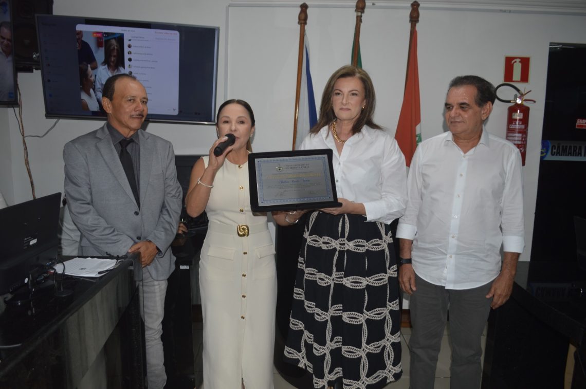Os trabalhos foram conduzidos pelo presidente Marcos Costa e contou com a presença dos parlamentares Júnior Lisboa, Gabriel Varjão, Régis da Saúde, Jediael e Márcio Freitas. Durante a sua fala, Fabíola enfatizou a honra de homenagear uma mulher que se destaca na sua atuação profissional, sendo querida pela comunidade pela forma com que exerce e trata os cidadãos. “Conceder um Título de Cidadão a alguém é dizer: a casa é sua e se torna ainda mais grandioso quando é para alguém que tem a honra de estar em nossa casa como você, Andrea. O seu agir, a sua postura nos orgulha, especialmente pelo cuidado com nosso povo, na luta contra a violência contra as mulheres. A casa é sua, a causa é nossa. Gratidão por aceitar se tornar integrante da nossa história”, disse Fabíola.