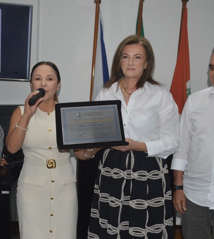 “Delmiro é o lugar que eu escolhi para viver minha vida nesse mundo”. Com essas palavras, a Defensora Pública Andréa Carla Tonin reforçou o seu agradecimento ao ser homenageada com o Título de Cidadã Delmirense, de autoria da vereadora Fabíola Marques Lima. A solenidade, que aconteceu nesta quinta-feira (30), reuniu vereadores, autoridades, familiares e populares.