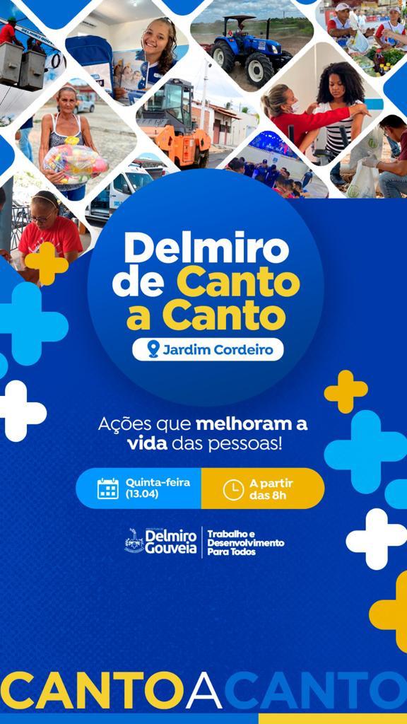 Nesta quinta-feira (13), o programa “Delmiro de canto a canto, ações que melhoram a vida das pessoas” vai ser realizado no Distrito Jardim Cordeiro, área rural do município. A proposta do evento é disponibilizar ações em todas as áreas da administração pública e que contribuam com a melhoria dos delmirenses.