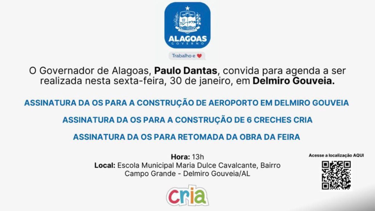 Entre as ações previstas está a assinatura da ordem de serviço para a construção do Aeroporto de Delmiro Gouveia.