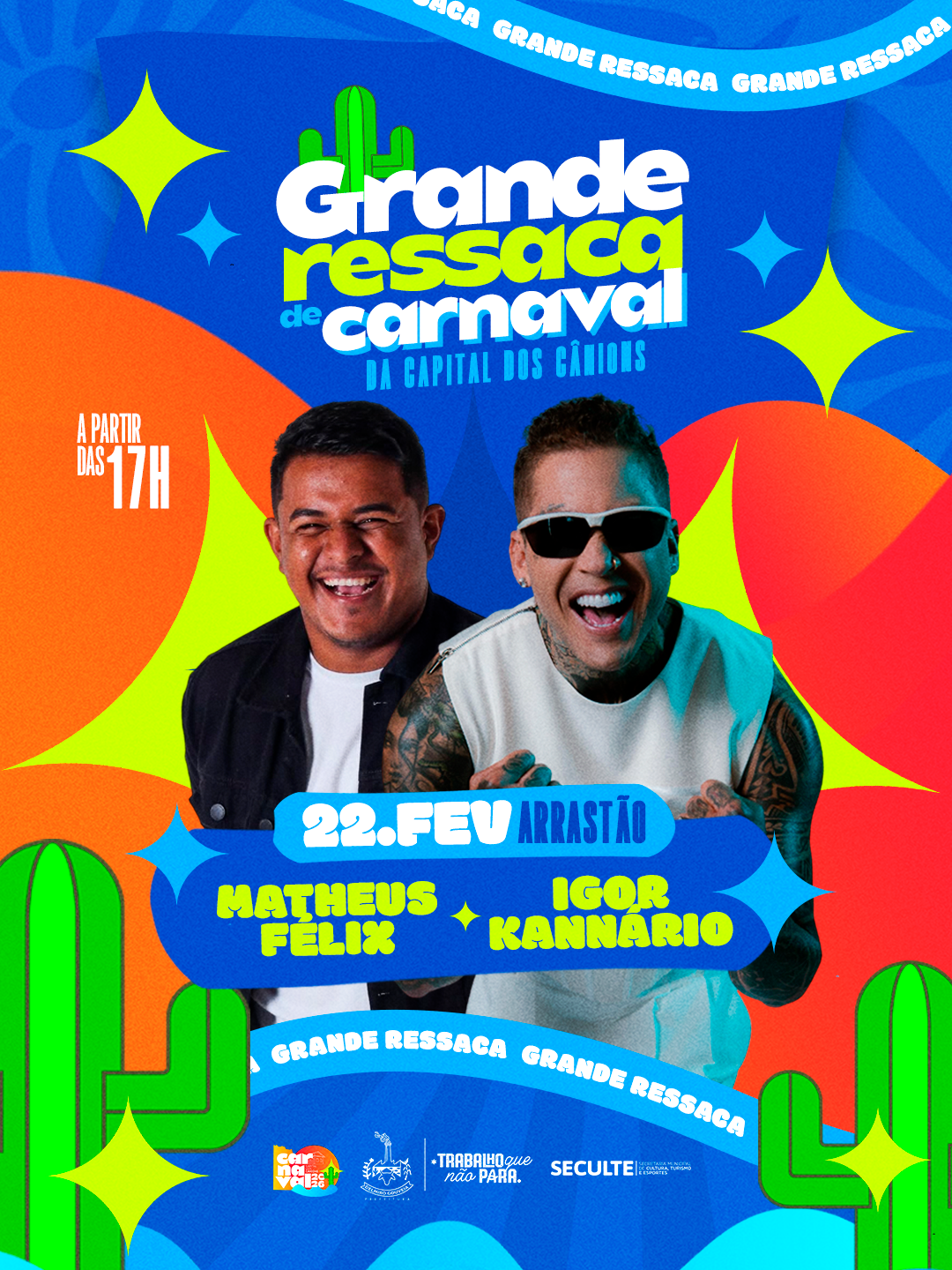 Para encerrar a programação em grande estilo, o domingo de Ressaca promete não deixar ninguém parado. A concentração começa a partir das 17h, preparando o público para um arrastão que percorrerá o corredor da folia. As atrações confirmadas para comandar essa última jornada são Matheus Félix e o Príncipe do Gueto, Igor Kannário, que promete arrastar uma multidão para celebrar o sucesso absoluto do evento.