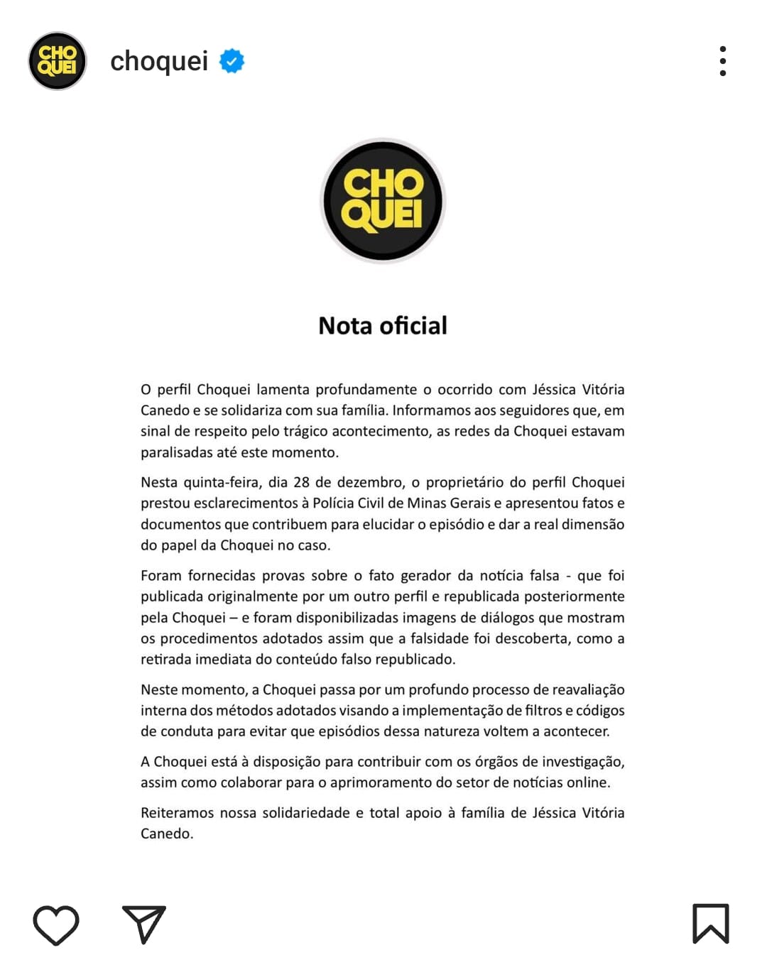 Hoje, o dono do perfil “Choquei” compareceu para prestar depoimento à Polícia Civil de Minas Gerais no âmbito do inquérito que investiga a morte de Jéssica Vitória Canedo. A jovem tirou a própria vida na semana passada, em 22 de dezembro, após ser vítima de informações falsas relacionadas a um suposto envolvimento amoroso com o humorista Whindersson Nunes.