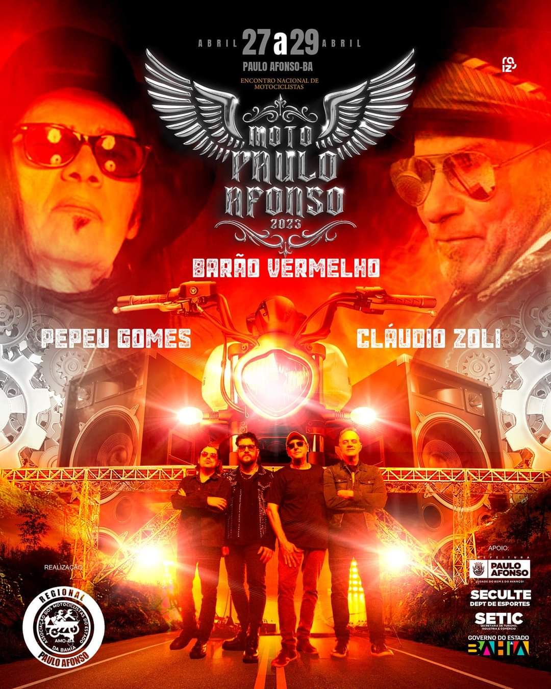 Para o Moto Paulo Afonso, que acontece de 27 a 29 de abril, Cláudio Zoli, Pepeu Gomes e Barão Vermelho embalam um dos maiores encontros de motos do país. Além das bandas nacionais, grupos regionais e a prata da casa também farão parte. Em sequência, no dia 30, Raquel do Teclados será a atração da Festa do Trabalhador, no dia anterior ao feriado de 1º de maio, celebrando os trabalhadores pauloafonsinos.