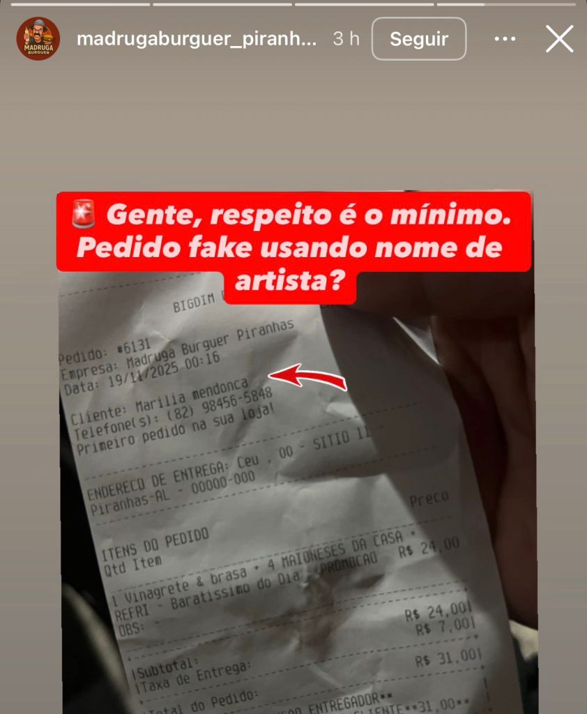 A madrugada desta quarta-feira (19/11) trouxe um episódio inesperado para a equipe do Madruga Burguer, em Piranhas. Um pedido inserido no sistema da lanchonete utilizou indevidamente o nome de uma artista nacional, em uma tentativa deliberada de criar confusão e atrapalhar o funcionamento do estabelecimento.