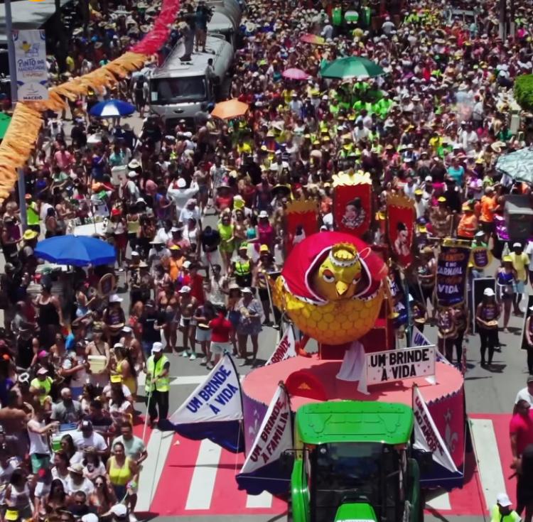 Com o tema, “O Pinto da Madrugada é massa, um brinde à vida”, o maior bloco de carnaval de Alagoas e Patrimônio Imaterial da Cultura Alagoana, em parceria com a Prefeitura de Maceió, desfilou sábado, dia 11, levando pela avenida cerca de 400 mil pessoas ao som de 18 orquestras alagoanas e alegorias enaltecendo o frevo. “Foram quase mil músicos no chão, arrastando pela orla toda essa simbologia do carnaval tradicional que o Pinto da Madrugada representa”, disse Hermann Braga, dirigente do bloco.