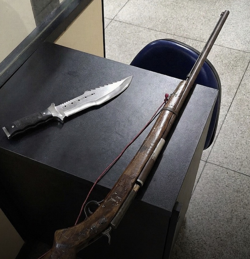 Durante as diligências na área, a guarnição apreendeu uma espingarda artesanal do tipo anticarga e uma faca. O suspeito não foi localizado no momento da ocorrência, porém acabou sendo identificado por documentos encontrados na residência.