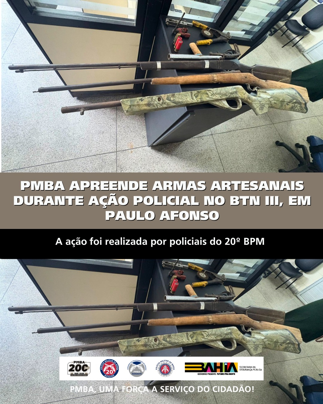Na manhã desta segunda-feira (08/12), policiais do 20º Batalhão de Polícia Militar (20º BPM) apreenderam armas artesanais e munições durante uma ação realizada no bairro Tancredo Neves III, em Paulo Afonso.