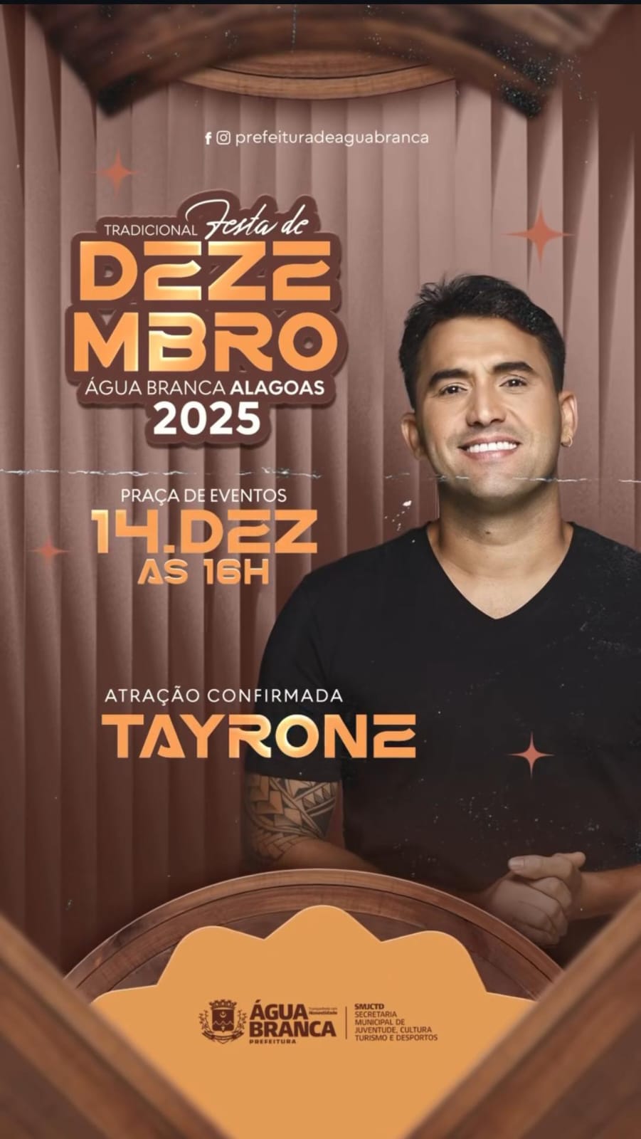 A Prefeitura de Água Branca confirmou a primeira grande atração da Tradicional Festa de Dezembro 2025: o cantor Tayrone, um dos maiores nomes do arrocha romântico do Brasil. O show está marcado para o dia 14 de dezembro, a partir das 16h, na maior Praça de Eventos de Alagoas.