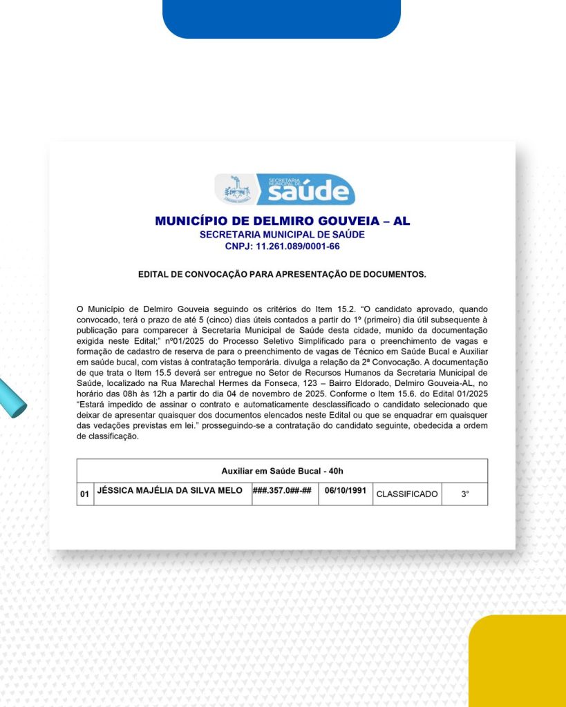 A Prefeitura de Delmiro Gouveia, por meio da Secretaria Municipal de Saúde, publicou nesta terça-feira a segunda convocação do Processo Seletivo Simplificado para os cargos de Técnico em Saúde Bucal e Auxiliar em Saúde Bucal. Além disso, também foi divulgada a quarta convocação referente ao cargo de Condutor de Veículo de Emergência (Categoria D).