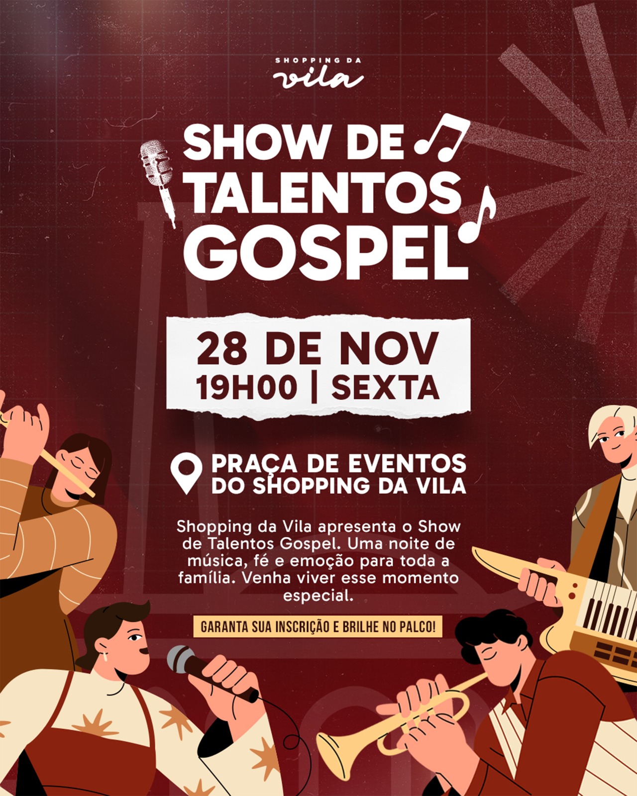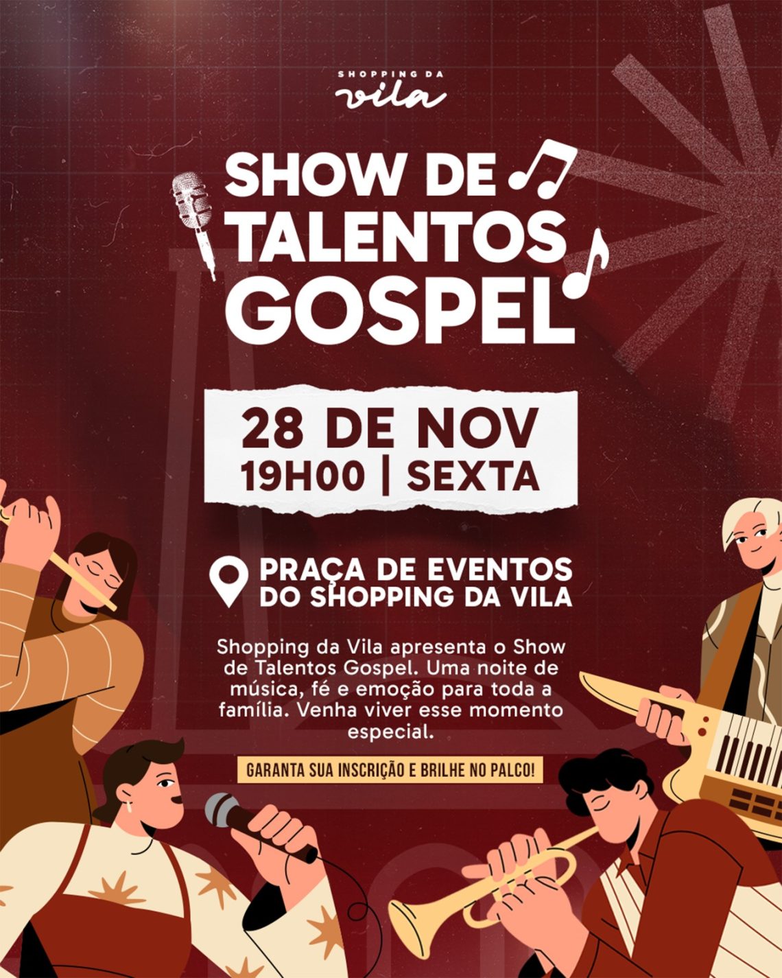O Shopping da Vila se prepara para receber uma noite especial de música, arte e espiritualidade. Nesta quinta-feira, 28 de novembro, a partir das 19h, o centro de compras realiza o Show de Talentos Gospel, um evento aberto ao público e pensado para celebrar a fé de forma coletiva e acolhedora.