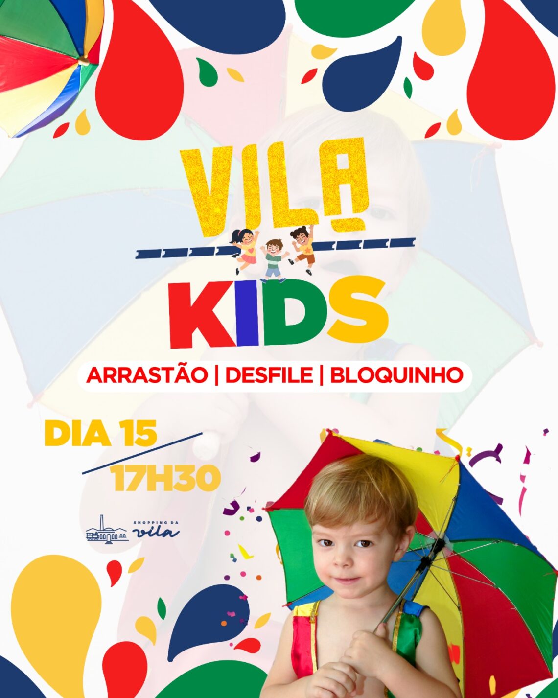 Anota aí na sua agenda, próxima quarta-feira, dia 15 de fevereiro, a partir das 17h30, chame toda família, e vem curtir, o Bloquinho Vila Kids no Shopping da Vila.