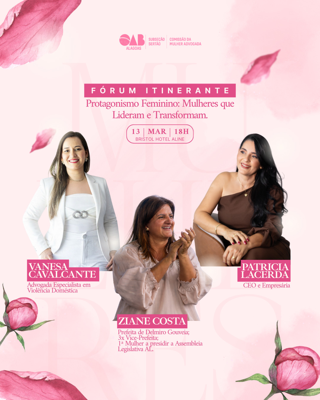 O fórum é uma iniciativa da OAB Alagoas, por meio da Subseção Sertão e da Comissão da Mulher Advogada. Além da prefeita de Delmiro Gouveia, que traz em seu currículo a marca de ser a primeira mulher a presidir a Assembleia Legislativa de Alagoas e três mandatos como vice-prefeita, o painel contará com a participação da advogada especialista em violência doméstica, Vanesa Cavalcante, e da empresária e CEO Patrícia Lacerda.